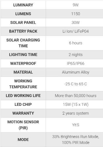 1. No manual ON-OFF required (Fully automatic) 2. No maintenance required (Lithium-ion battery) 3. Long Life of product +15 Years 4. Long battery Life +3 years 5. Quick & Easy installation 6. Long installation distance between two light (upto 15Mtr) 7. Available in 12W, 15W, 20W & 25W LED 8. Motion sensor - uses energy as required 9. Up to two days autonomy 10. Available in 40Wp/ 60Wp panel 11. Ready to use
