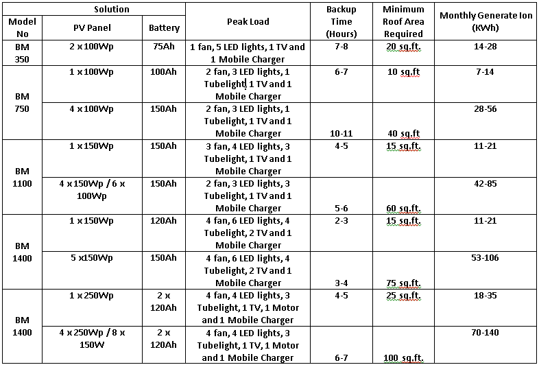 1. Simultaneous charges from mains & solar with priority to solar 2. Battery charging commences at 110 Volt mains voltage 3. Inbuilt protection from reverse polarity & reverse current 4. Inbuilt protection from short-circuit, over-charge and deep discharge 5. Pure since wave output from UPS (Except BM 350) 6. Best in class conversion efficiency of solar panels 7. Flexibility to use different types of batteries